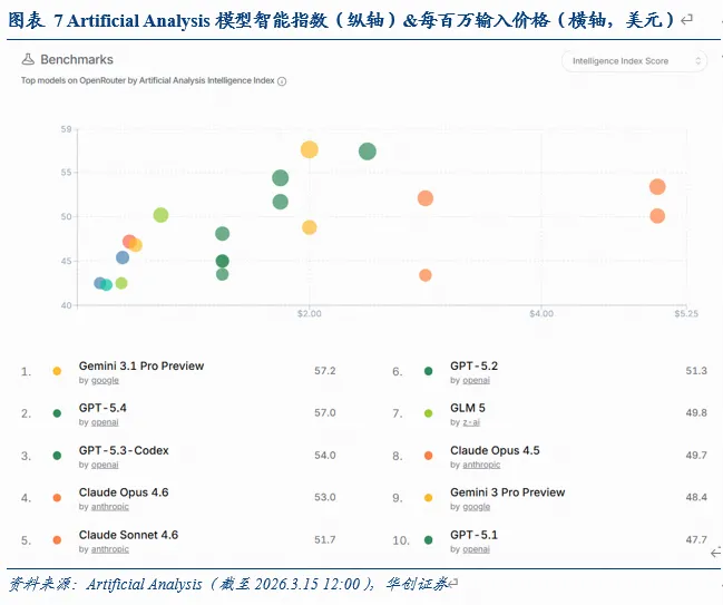 2)模型性能:据Artificial Analysis Intelligence Index,全球智能水平Top5模型分别为Gemini 3.1 Pro Preview/GPT-5.4/GPT-5.3-Codex/Claude Opus 4.6/Claude Sonnet 4.6。