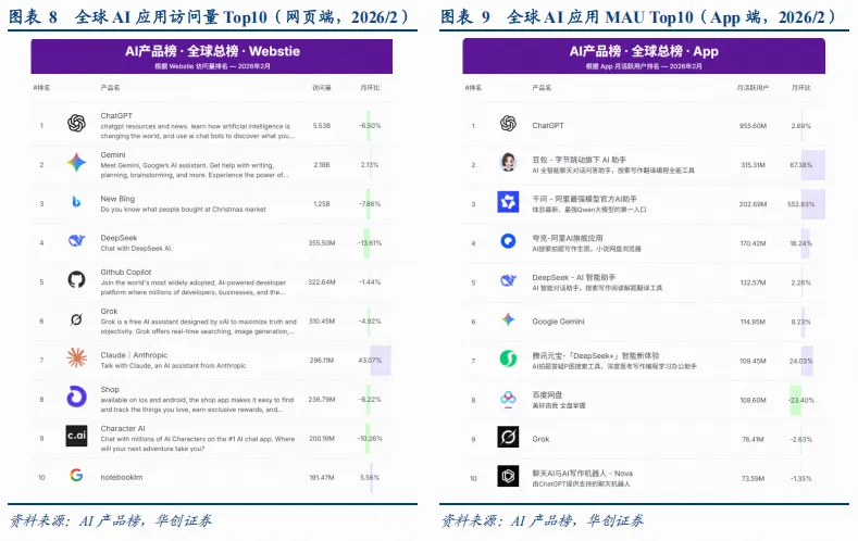 2026年2月,全球AI应用访问量/MAU Top10中:1)网页端:Claude月访问量环比增长43%,或系Claude模型于2月进行多次更新,其中先后推出Claude Opus 4.6、Claude Sonnet 4.6,在长上下文处理、代码能力、Agent等多方面提升。据Artificial Analysis评测,Claude两款新模型能力位列全球Top4/5,且其中Claude Sonnet 4.6开放给免费用户使用,推动访问量环比高增。2)移动端:春节期间,国内头部AI应用进行大规模推广运营活动,推动MAU环比大幅提升,其中排名前5的国产AI应用分别为:豆包(3亿MAU,环比+87%)、千问(2亿MAU,环比+553%)、夸克(1.7亿MAU,环比+18%)、DeepSeek(1.3亿MAU,环比+2%)、元宝(1.1亿MAU,24%)。