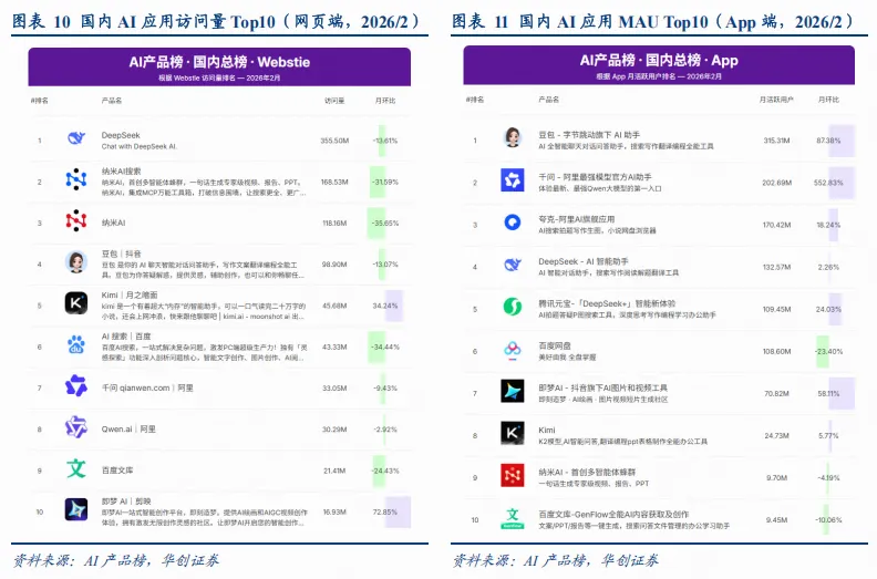 2026年2月,国内AI应用访问量/MAU Top10中:1)网页端:Kimi、即梦AI受益于新模型推出,月访问量分别环比+34%/73%。2)移动端:除头部Chatbot类应用受益于春节运营推广外,即梦AI移动端MAU超过7000万,环比+58%。