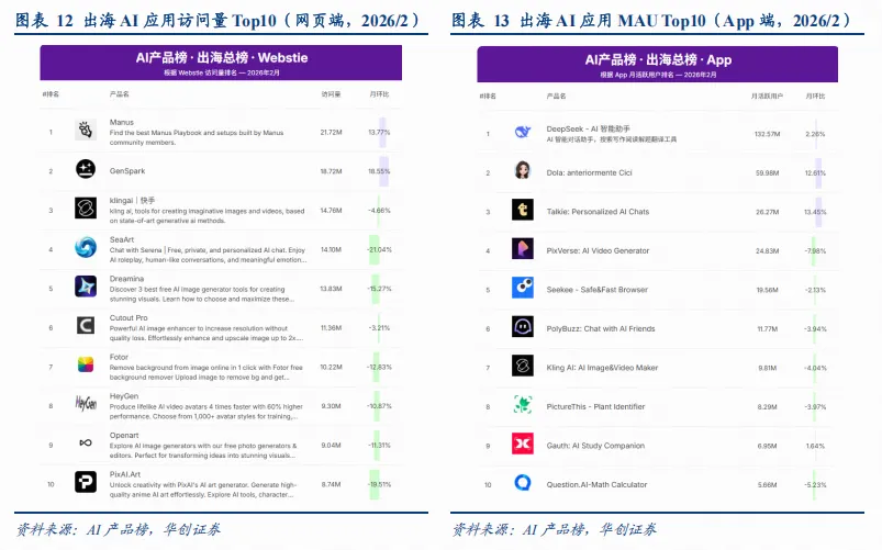 2026年2月,出海AI应用访问量/MAU Top10中:1)网页端:Manus、Genspark、可灵排名前三,月访问量环比分别+14%/+19%/-4.7%。2)移动端:DeepSeek、 Dola(豆包海外版)、Talkie位列前三名,MAU分别为1.3/0.6/0.26亿,月环比分别+2%/+13%/+13%。