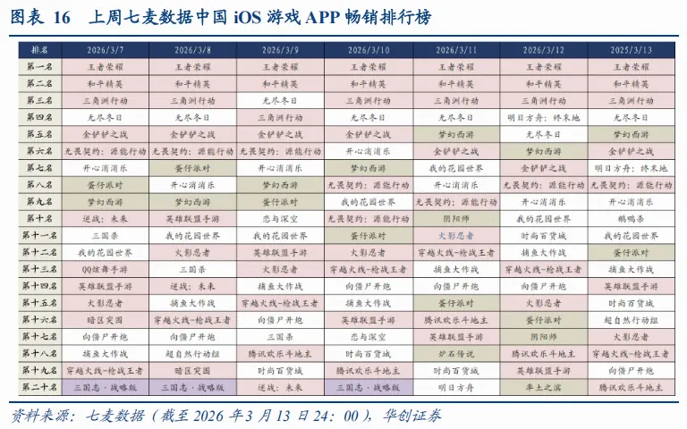 根据七麦数据,2026年3月9日至3月13日中国iOS游戏畅销榜显示,腾讯系产品依旧占据绝对优势,《王者荣耀》与《和平精英》全周稳定包揽前两名,《三角洲行动》大部分时间位居前三,整体表现仍然强势。《无尽冬日》本周基本维持在前四,《金铲铲之战》多数时间处于第5-6名区间,《梦幻西游》在周中后段排名有所抬升并进入前五。《我的花园世界》一度冲入前十;《恋与深空》本周整体排名落在10名以后。