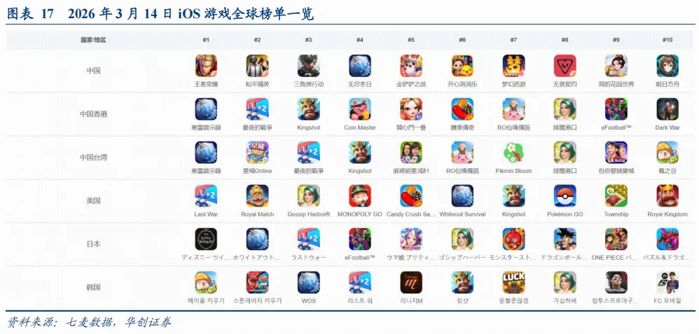 根据七麦数据,截至2026年3月14日,全球主要地区iOS游戏畅销榜显示,中国市场仍由腾讯系和重度产品主导,《王者荣耀》《和平精英》《三角洲行动》位居前三,《无尽冬日》《金铲铲之战》紧随其后,头部格局较为稳定;《开心消消乐》《我的花园世界》等休闲产品也进入前十。中国香港、中国台湾及美国市场则更偏向SLG与休闲产品,《Whiteout Survival》《Last War》《Kingshot》等排名居前,美国榜单中《Royal Match》《Gossip Harbor》《MONOPOLY GO!》等休闲游戏表现突出。日本、韩国市场本土产品占比更高,但《Whiteout Survival》《Last War》《Gossip Harbor》同样保持靠前。