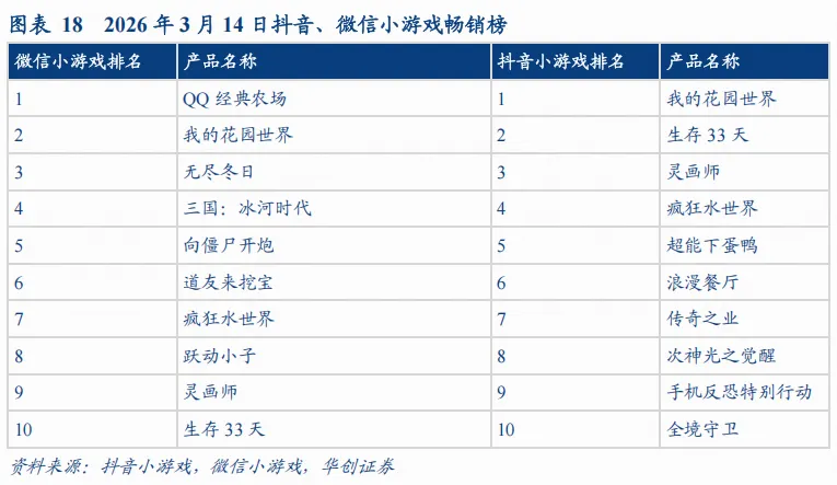 根据抖音小游戏、微信小游戏,截至2026年3月14日,微信端小游戏以经营养成、SLG和生存题材为主,《QQ经典农场》位居榜首,《我的花园世界》《无尽冬日》《三国:冰河时代》《向僵尸开炮》排名靠前。抖音端小游戏更偏轻度休闲和泛用户向内容,《我的花园世界》排名第一,《生存33天》《灵画师》《疯狂水世界》位居前列,《超能下蛋鸭》《浪漫餐厅》《传奇之业》等也进入前十。