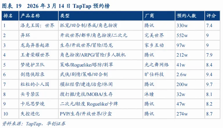 根据TapTap,截至2026年3月14日,TapTap预约榜前十仍以大厂新品储备为主,腾讯系产品优势明显,《洛克王国:世界》位居榜首,《王者荣耀世界》《粒粒的小人国》《卡厄思梦境》《失控进化》也均进入前十,腾讯在头部榜单中占据5席;非腾讯产品中,完美世界《异环》、家乡互动《龙岛异兽起源》排名靠前,且预约量和评分表现较好。