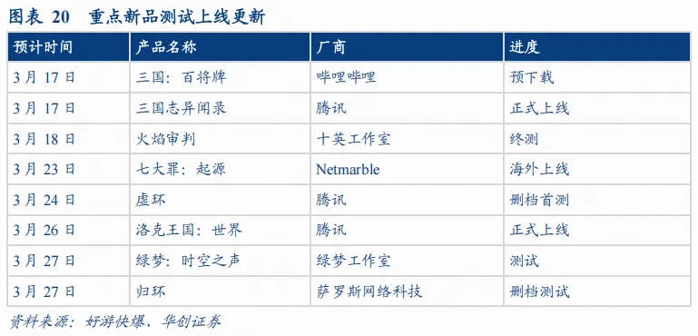 根据好游快爆,3月中下旬新游腾讯系储备仍最为集中,《洛克王国:世界》定档3月26日正式上线,《虚环》将于3月24日开启删档首测,《王者荣耀:世界》定档4月上线;同时,《火焰审判》将于3月18日开启终测,《绿梦:时空之声》与《归环》均定档3月27日开启测试。