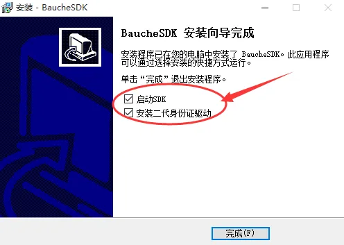 驱动安装完成后,需要启动SDK和安装二代身份证驱动。单击【完成】,继续安装二代身份证驱动,如下图8: