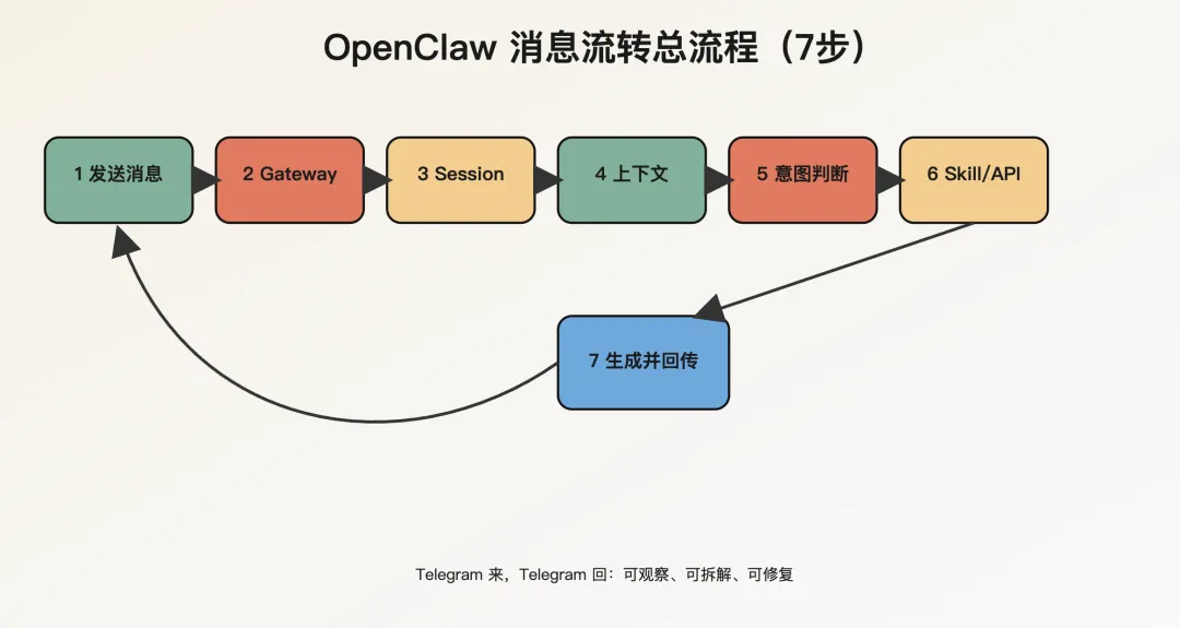 这就是 OpenClaw 里,一条消息从输入到输出的完整流转路径。