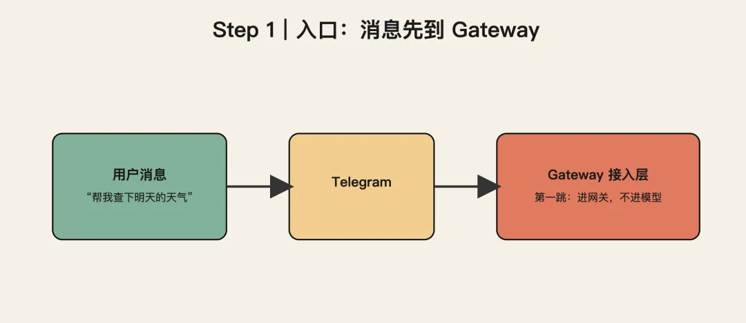 这条消息不会直接到模型, 而是先到 Gateway。