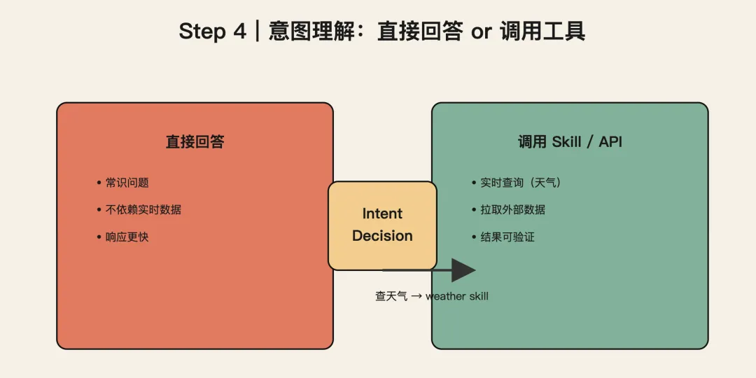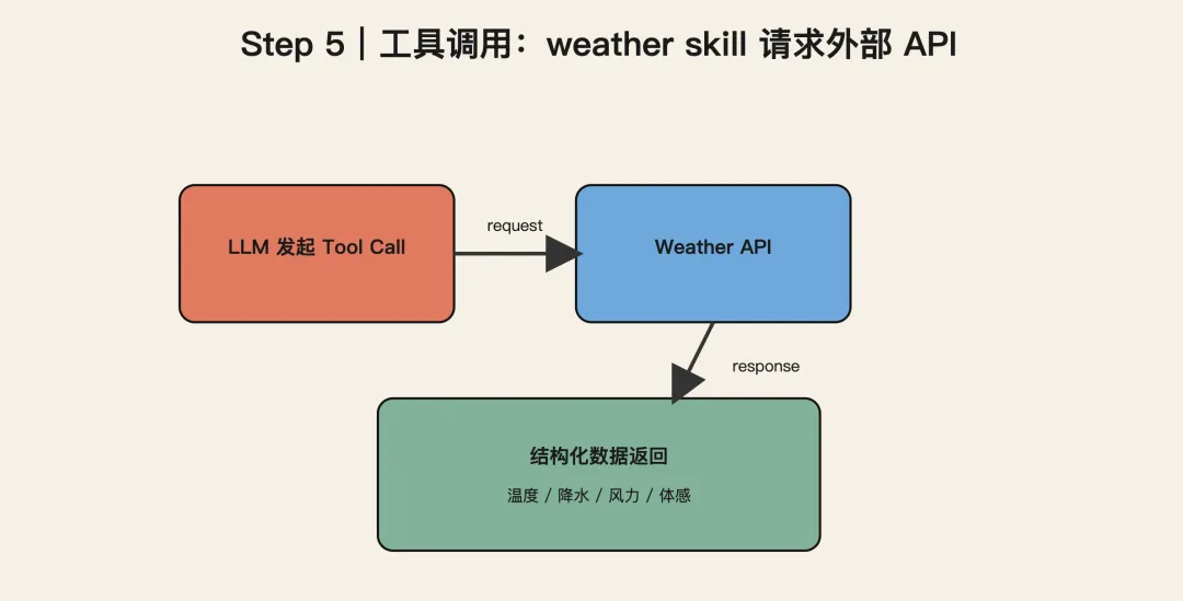 在“查天气”这个例子里,模型会识别: 你的需求是“获取实时天气数据”。