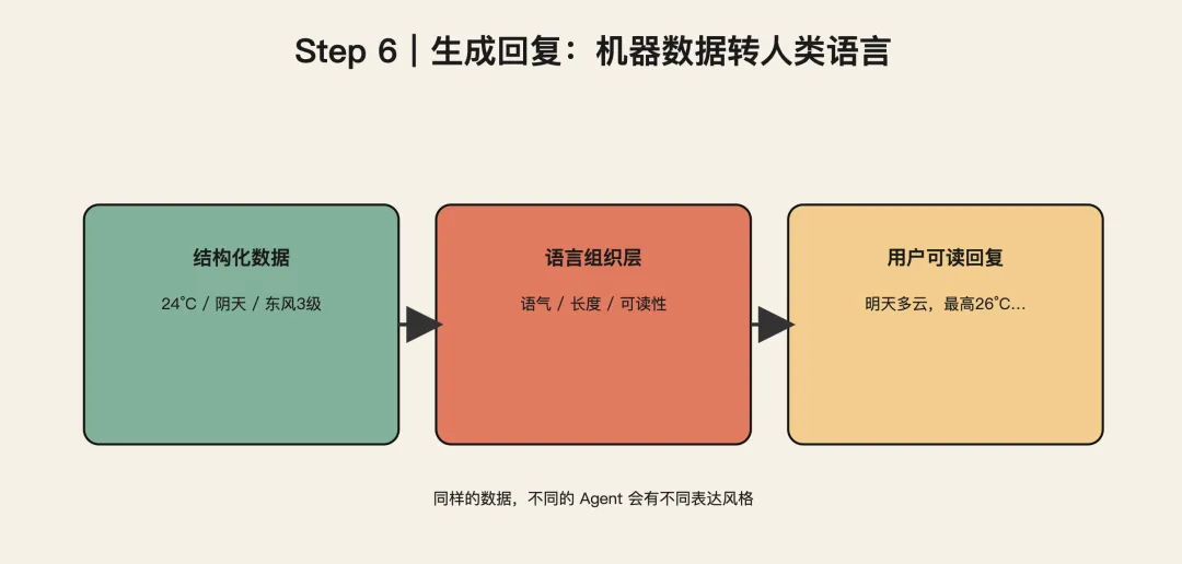 Agent 拿到天气数据后, 会把这些数据整理成你能直接看懂的一句话。