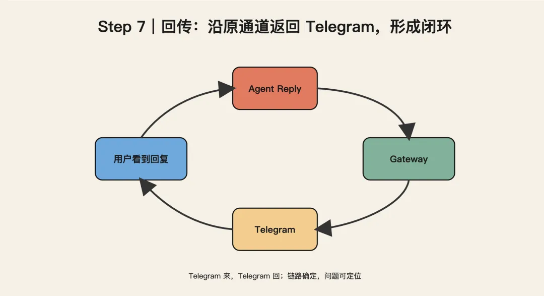 最后,回复会通过 Gateway 发回 Telegram。