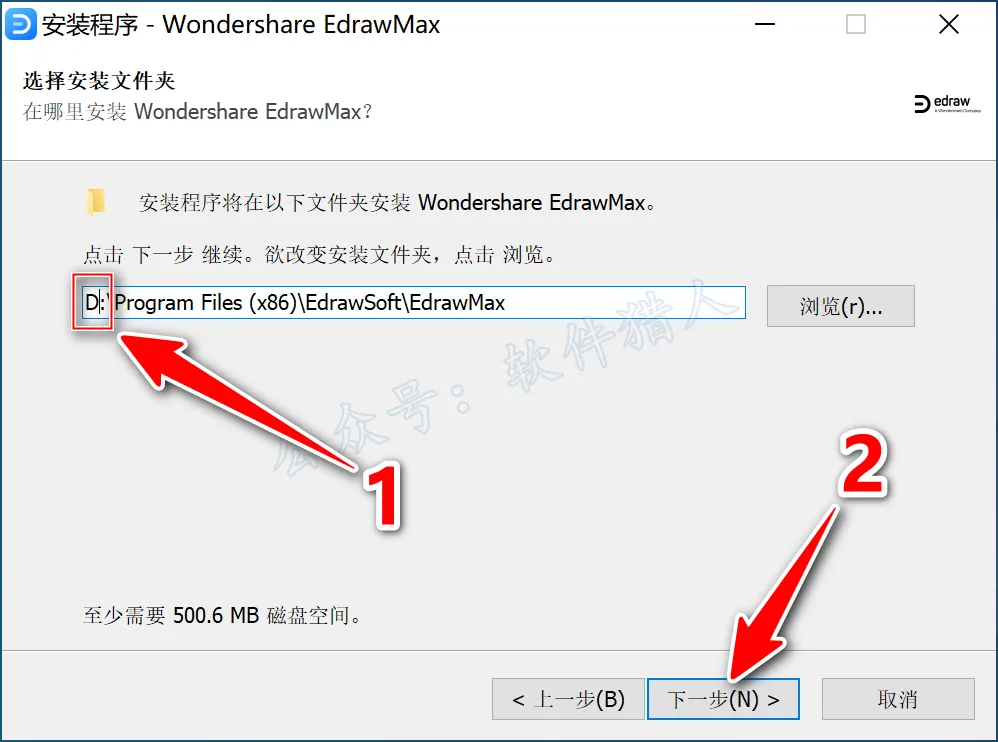 5.将软件安装路径的第一个字符C更改为D(表示将软件安装到D盘),点击【下一步】。