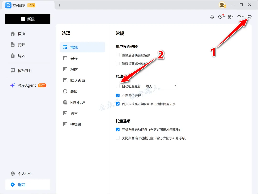 15.进入软件后点击右上角的【设置】图标,取消勾选【自动检查更新】。请务必关闭更新,否则更新后可能软件失效。