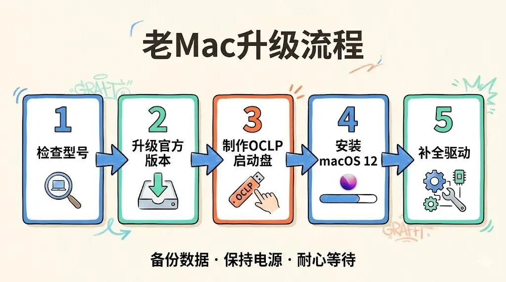 ⚠️ 注意:OpenClaw、微信、飞书等大多数AI工具都要求 macOS 12(Monterey) 以上才能安装。旧Mac官方最高只能升到11,所以需要绕道。
