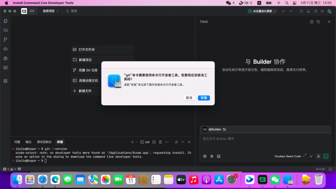 git --version# 输出 git version 2.x.x 则已安装,可跳过- 3.如果提示未找到,macOS 会自动弹出安装 Xcode Command Line Tools 的提示,点击「安装」即可