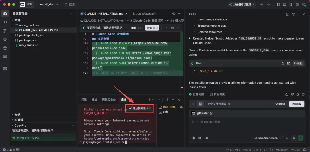 npm install -g @anthropic-ai/claude-code安装过程中,出现错误会自动弹出「添加到对话」,点击输入到对话框内,然后在对话框和Trae对话,让Trae去自动解决。