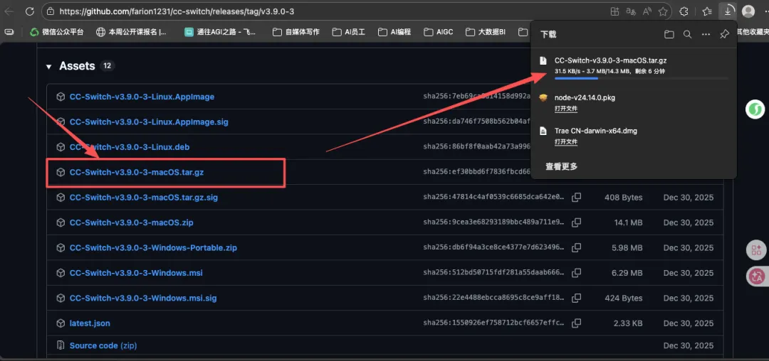 - 前往 CC-Switch 项目页面下载(Mac 选对应版本),网址:https://github.com/farion1231/cc-switch/releases/tag/v3.9.0-3