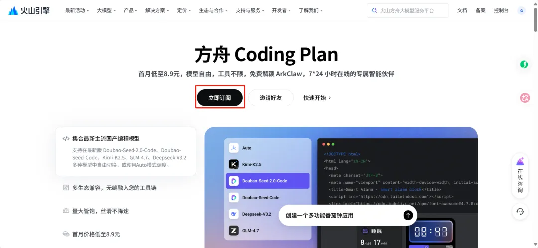 为什么推荐火山方舟 Coding Plan ?因为它有月套餐,基本无限量使用,非常适合日常跑任务。