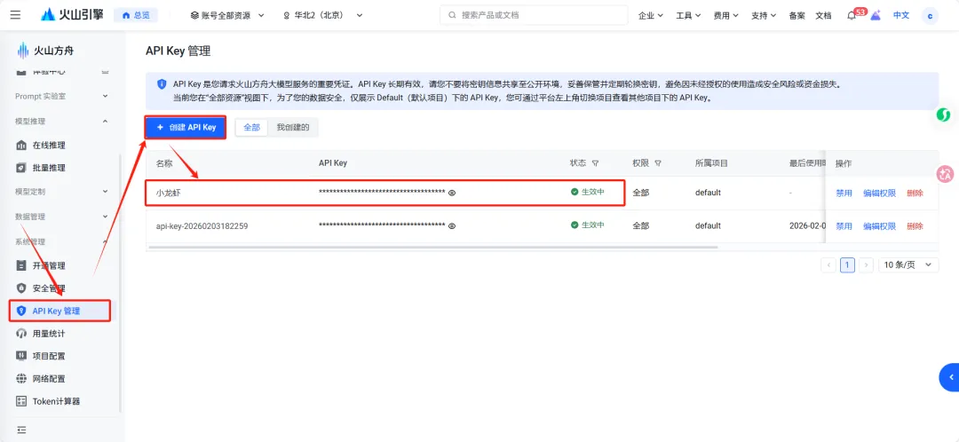 - 订阅完后,打开火山引擎的"API 管理"页面(https://console.volcengine.com/ark/region:ark+cn-beijing/apikey?apikey=%7B%7D)创建一个新的密钥,复制保存好