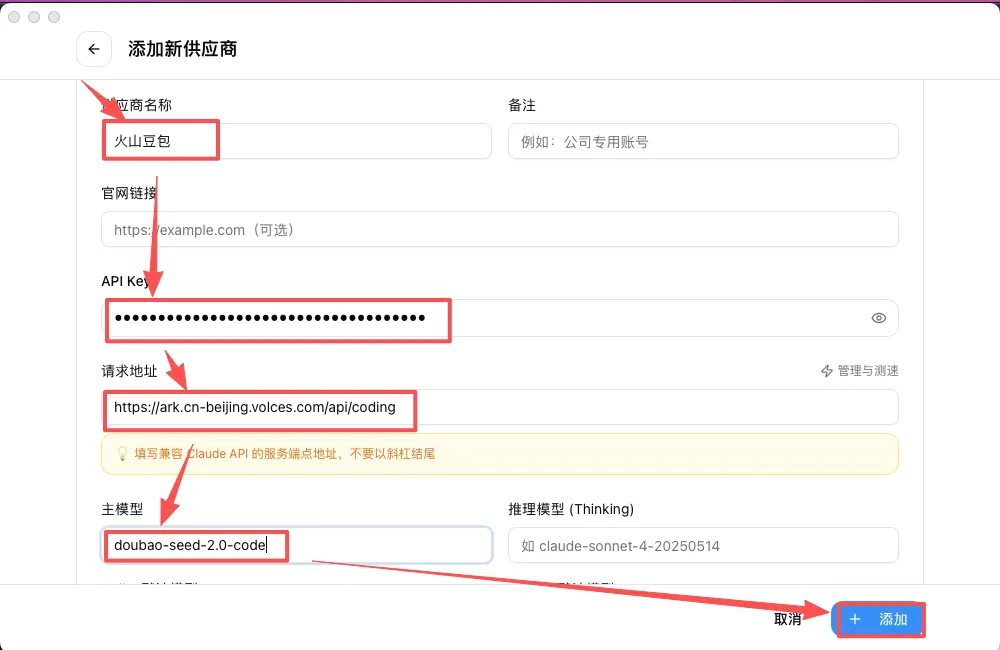 - 在获得API之后,在 CCSwitch 里点击右上角「添加模型」,进入选择「自定义配置」,在下面的表格中填入:供应商【火山豆包】,API Key【您自己刚才创建的 API Key】请求地址【https://ark.cn-beijing.volces.com/api/coding】,主模型【doubao-seed-2.0-code】,最后点「添加/保存」。