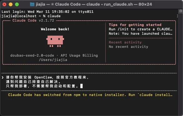 📋 第一步:让 Claude Code 自动安装 OpenClaw