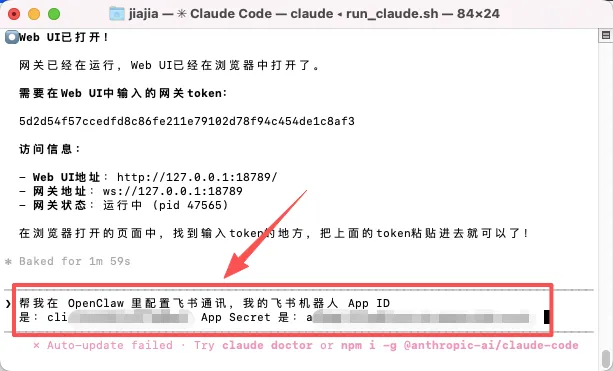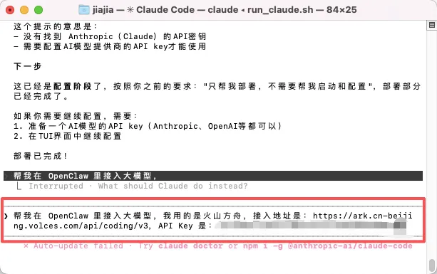 让 OpenClaw 真正"智能"起来,需要接入一个大模型。继续在 Claude Code 里发: