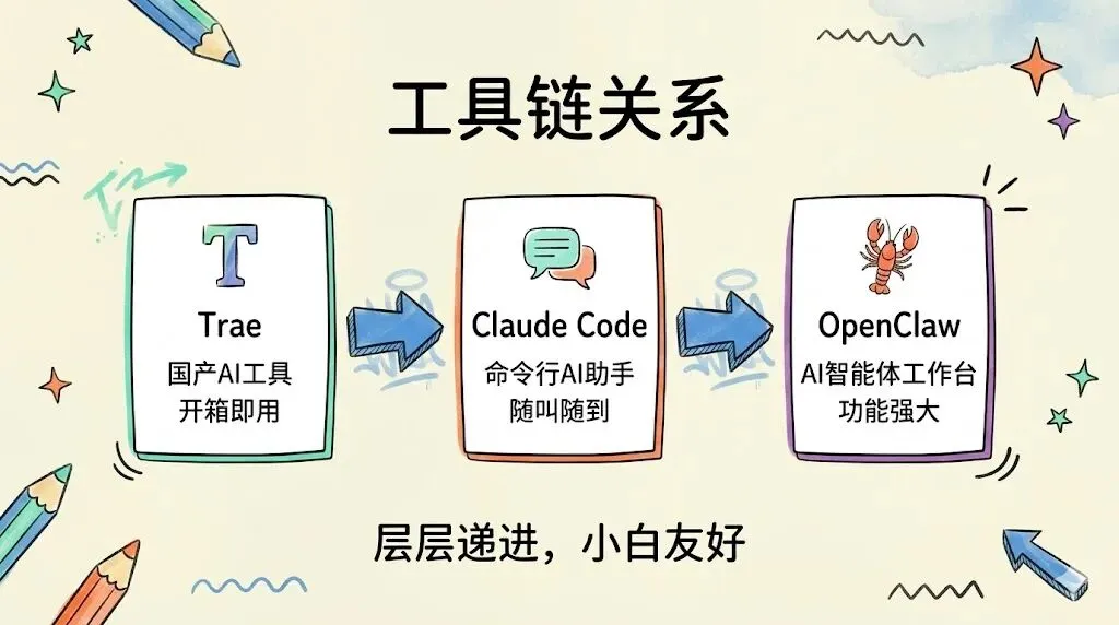 💡 三个工具的关系:Trae 是起点(国产、易用、无需梯子)→ 用 Trae 装 Git + Claude Code → 用 CC-Switch 切换大模型 API → 最后用 Claude Code 一句话部署并配置好 OpenClaw。层层递进,稳稳当当。