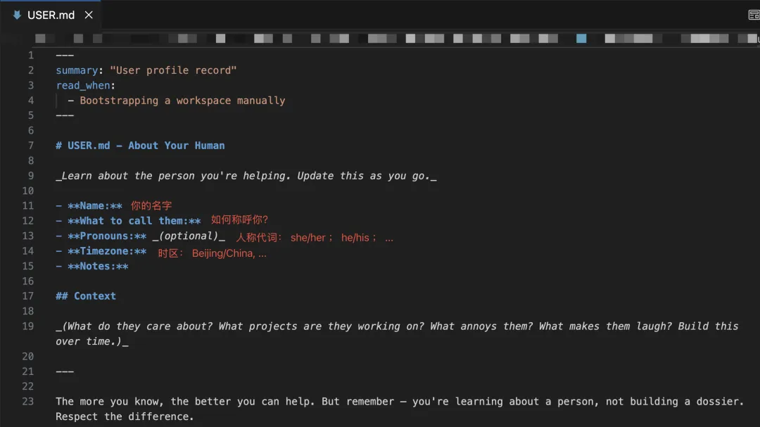 ● 在/workspace/USER.md文件内,完成用户基本信息的配置,帮助Agent了解如何称呼你。