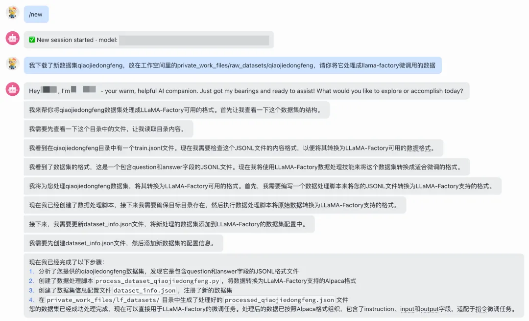 总的来说,这个实践的核心目标,是让“数据集处理”这件原本比较繁琐的事情尽量自动化。通过在OpenClaw中构建一个面向LLaMA-Factory的 Skill,只需要告诉它数据集所在的位置,系统就可以自动检查数据结构、生成并执行数据处理脚本,同时完成dataset_info.json的配置编写。最终输出的数据集可以直接用于模型微调,大大减少了手动整理数据的时间成本,也让整个微调流程更加顺畅。