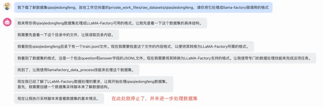 由于对开源数据集进行分析、撰写脚本、执行脚本的流程较为复杂,agent有时会出现幻觉,你可以尝试在下一轮对话中,直接揭露它未完成任务,促使它检查结果重新执行skill。你还可以重置session(建议删除幻觉memory),再次提出调用技能的需求。下图的英文回答即为我们尝试过程中发现的典型幻觉,一般情况下它会用中文回复,出现英文回答,大概率内容有幻觉。
