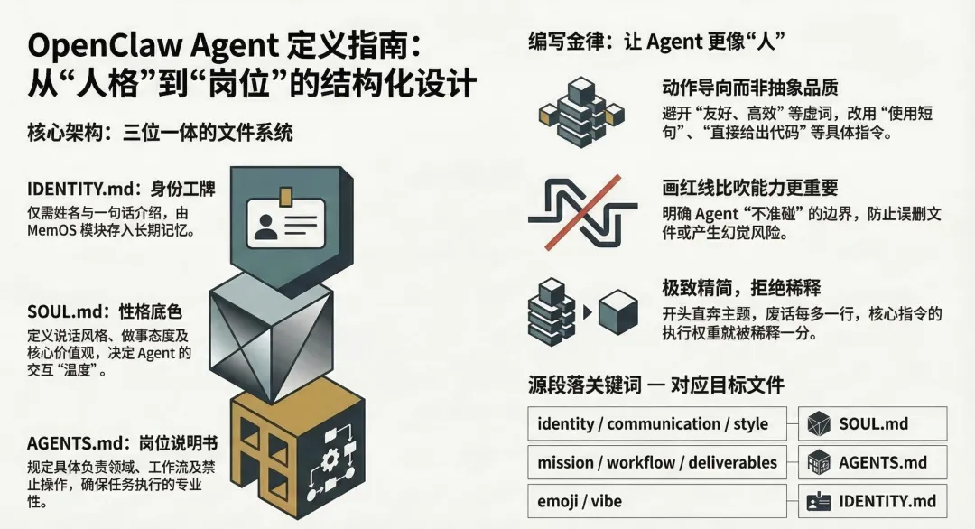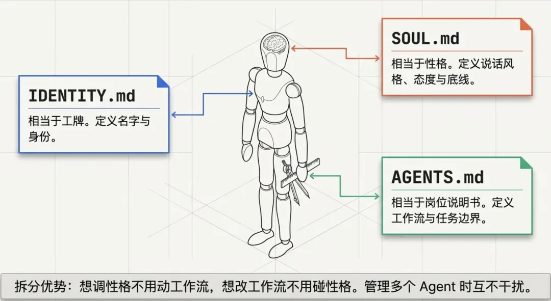 一句话记住:IDENTITY 是工牌,SOUL 是性格,AGENTS 是岗位说明书。