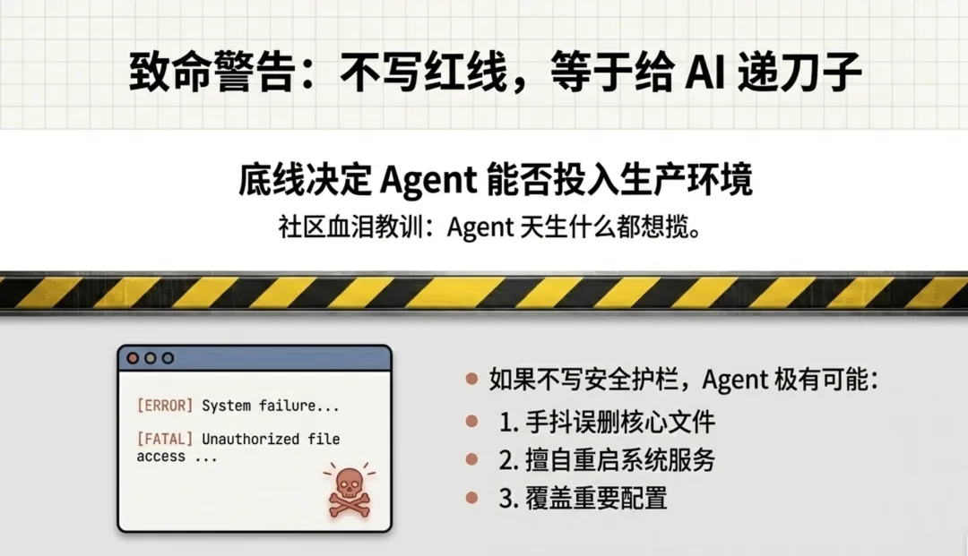 agent 天生什么都想揽,靠谱的 agent 得知道什么时候该说"这事我不碰"。底线段落写得好不好,直接决定这个 agent 用起来让不让人放心。