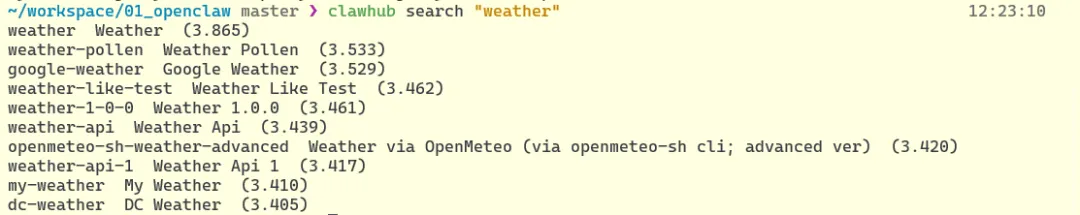 # 安装最新版本的技能clawhub install weather# 安装指定版本clawhub install weather --version 1.0.0# 查看已安装技能列表clawhub list4. 更新技能