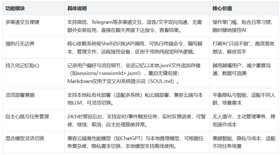 OpenClaw的功能围绕“执行”核心展开,涵盖交互、执行、记忆、部署等多个维度,兼顾便捷性与扩展性,核心亮点如下: