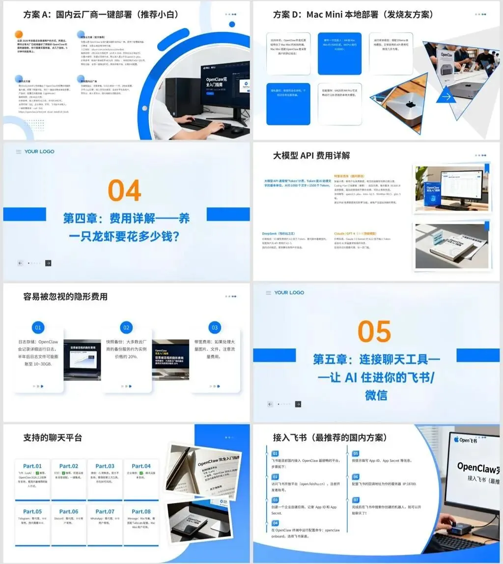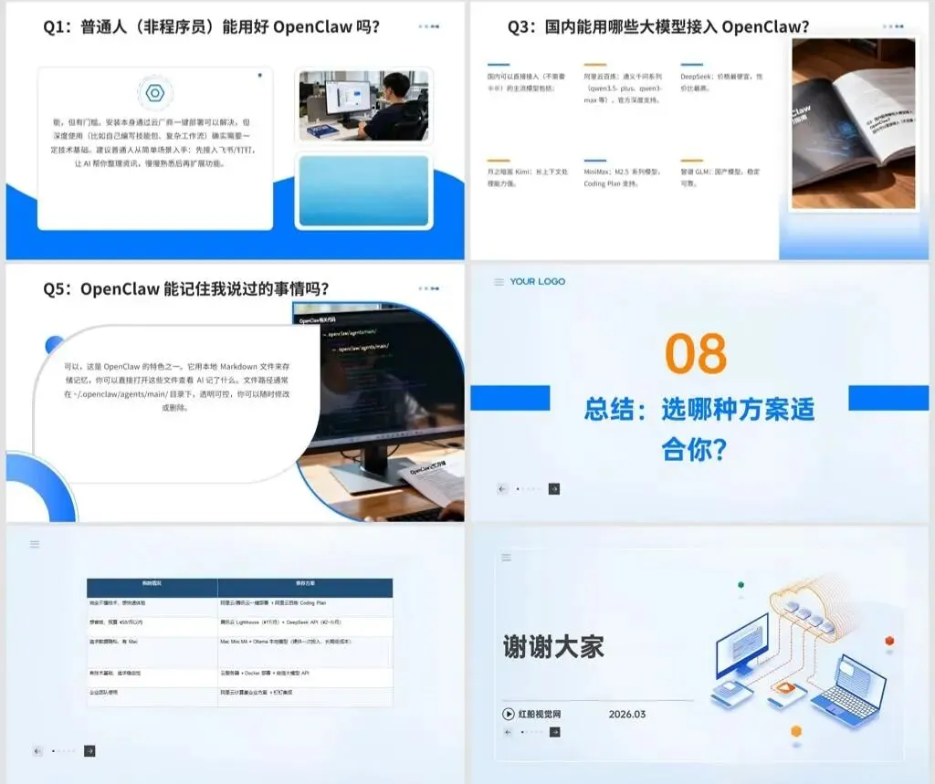 有个工具,你让它「每天早上把行业新闻总结发给我」,它真的会自己去查、自己整理、自己发到你手机上。你让它「帮我整理这个文件夹」,它真的会动。不是 ChatGPT,不是 Kimi,是 OpenClaw——一个连 Elon Musk 都公开点赞的开源 AI 执行工具。OpenClaw 完全入门指南附实操安装指南教程ppt课件,讲稿字数:6260字,ppt页数:38页。