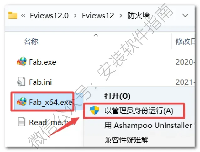 20、返回之前解压的“Eviews12”文件夹,双击打开“防火墙”文件夹,找到并选中“Fab_x64.exe”,鼠标右键点击“以管理员身份运行”