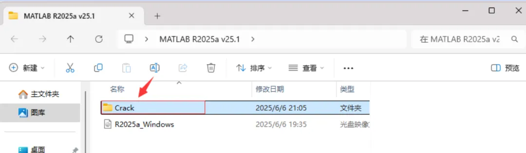 打开解压后的MATLAB R2025a v25.1文件夹,进入到Crack文件夹。
