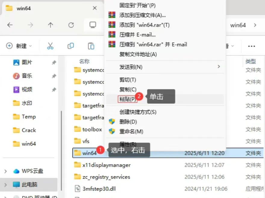 选中win64文件夹右击然后点粘贴。