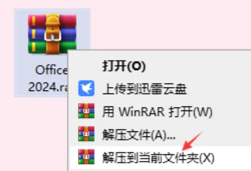 1.把链接中的Office安装包下载到电脑上,解压安装包:①鼠标右击【Office 2024】压缩包②选择"解压到当前文件夹"