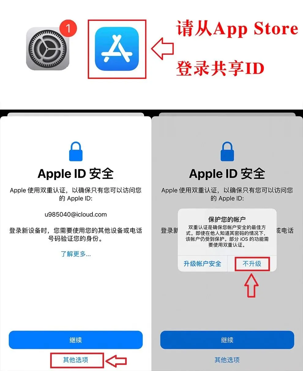 首先去AppStore退出自己原来的账号,然后复制粘贴输入我们分享的账号和密码,点击登录,提示升级到双重认证请点击下面【其他选项】然后选择【不升级】即可正常使用。