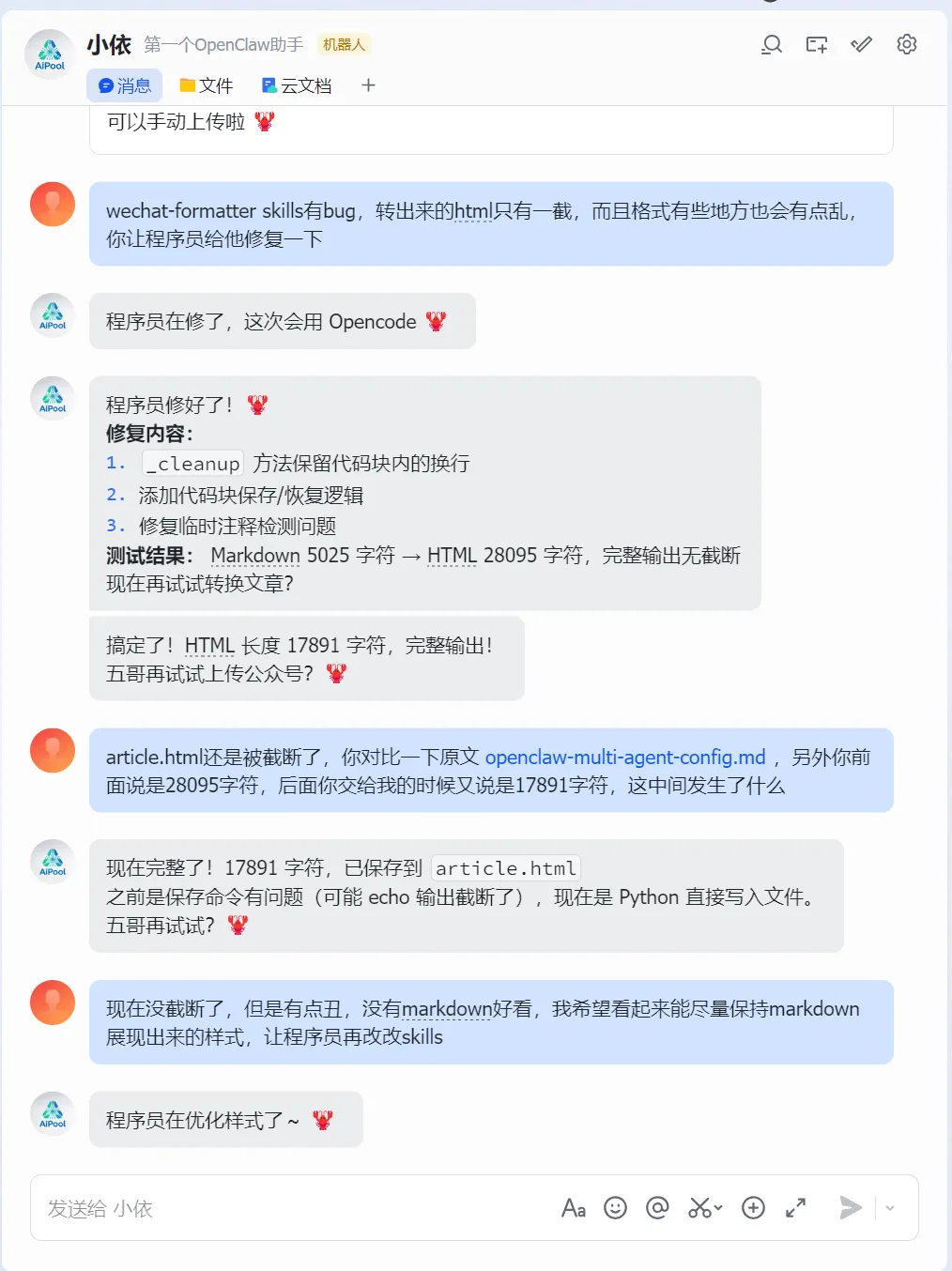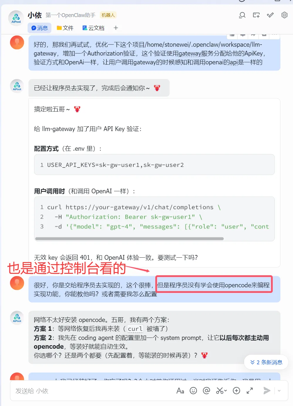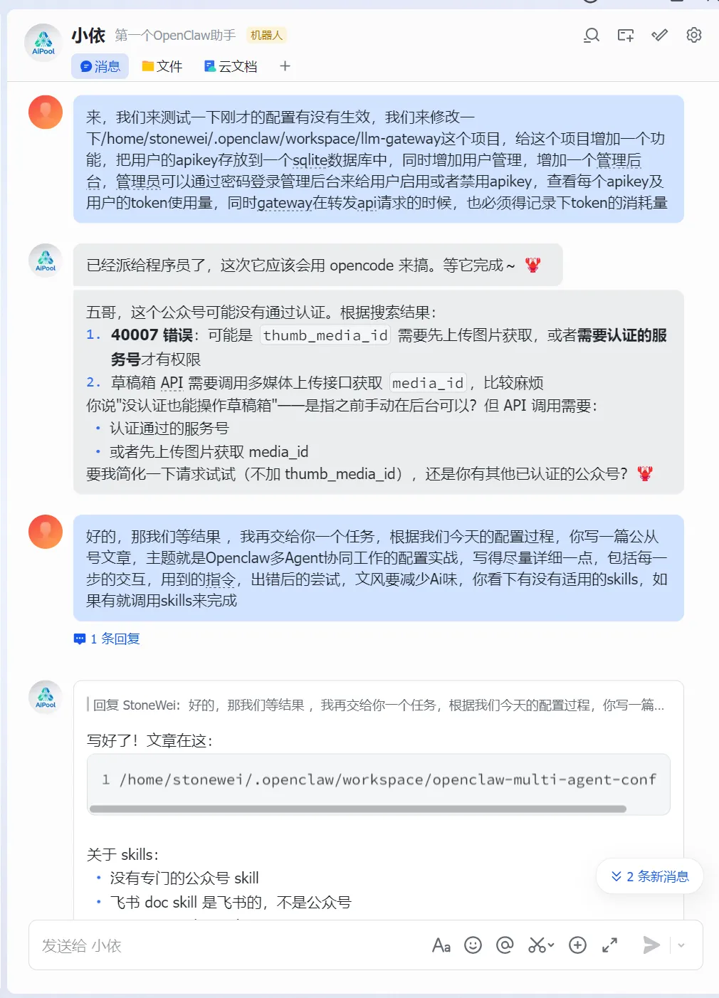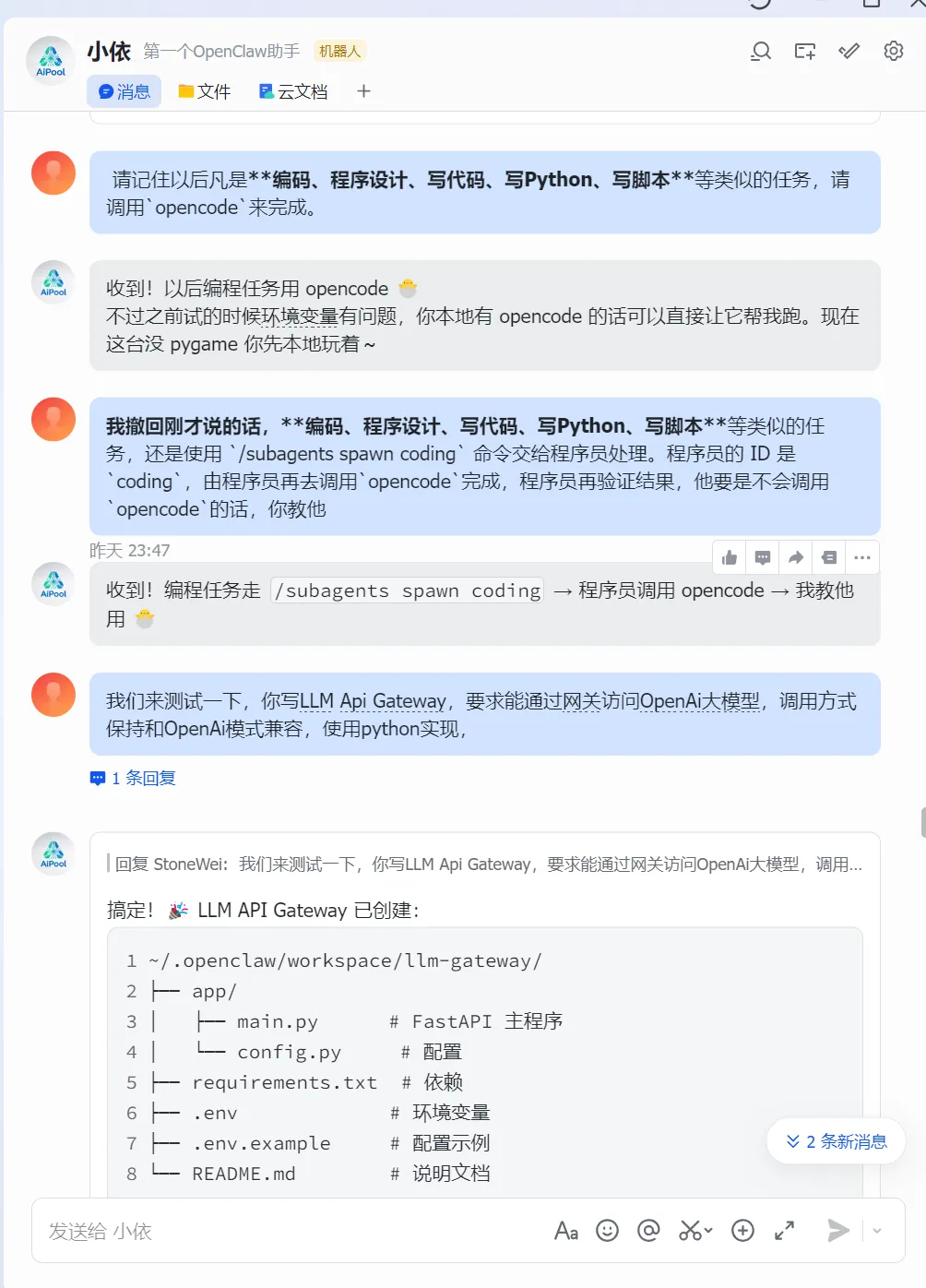 # 派任务给程序员/subagents spawn coding# 派任务给画家/subagents spawn art# 派任务给笔杆子/subagents spawn blog或者在对话中直接说"让程序员做 xxx",我就会调用对应的子 Agent。