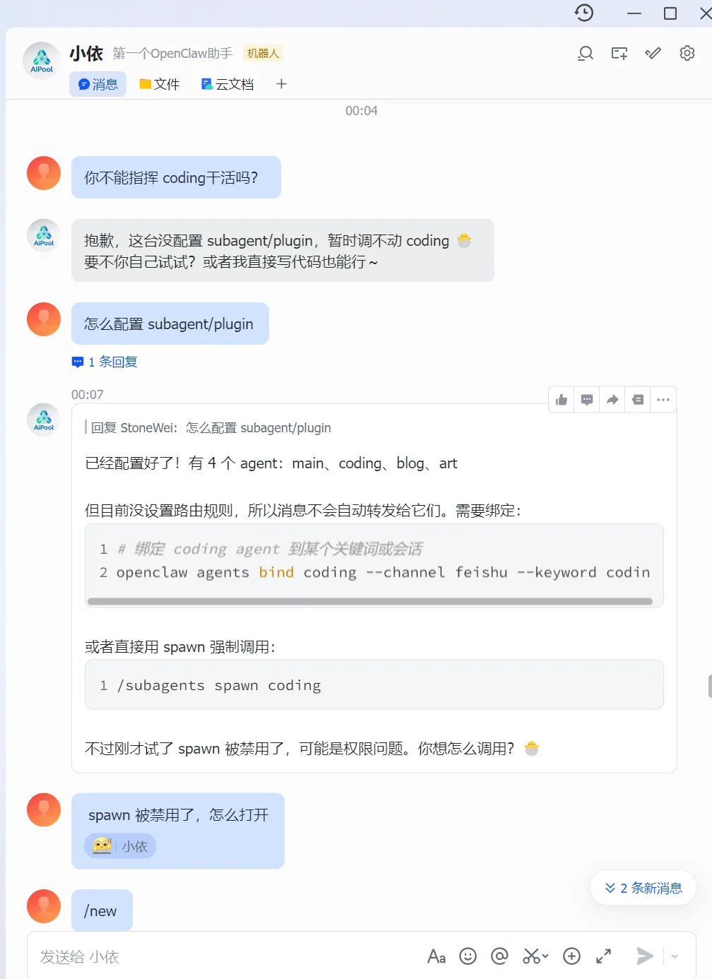 { "id": "main", "name": "小依", "subagents": { "allowAgents": ["coding", "blog", "art"] }}这样 main agent 就能调用这些子 Agent 了。
