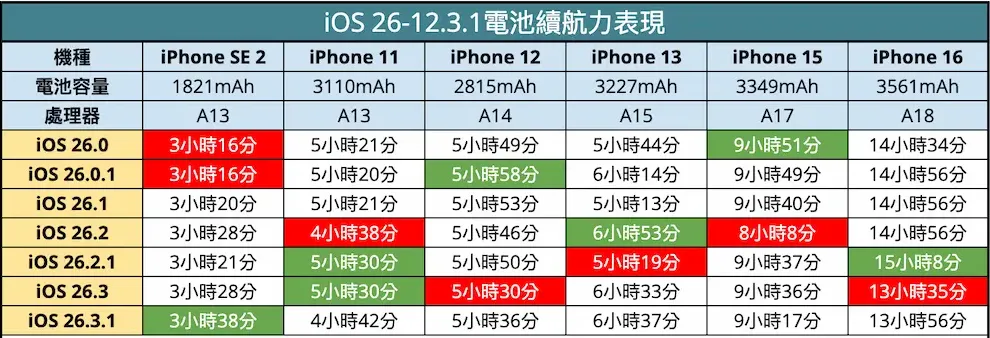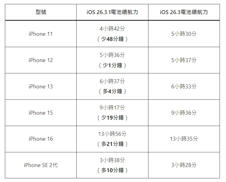 先讲讲硬数据。YouTuber iAppleBytes针对多款旧机型进行了iOS 26.3.1和iOS 26.3的续航对比测试,结果呈现出有好有坏的情况。