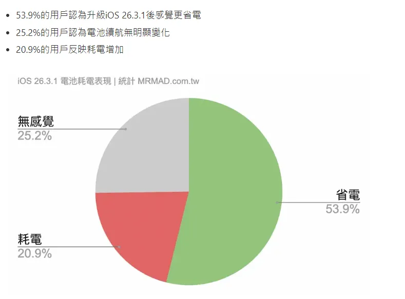 再结合用户反馈的情况来看,超过53%的用户升级之后觉得更省电,觉得耗电增加的就只有大概20%多一点。从比例上看,整体是朝着好的方向发展,但是那20%用户的体验确实不能忽略,尤其是集中在iPhone上。