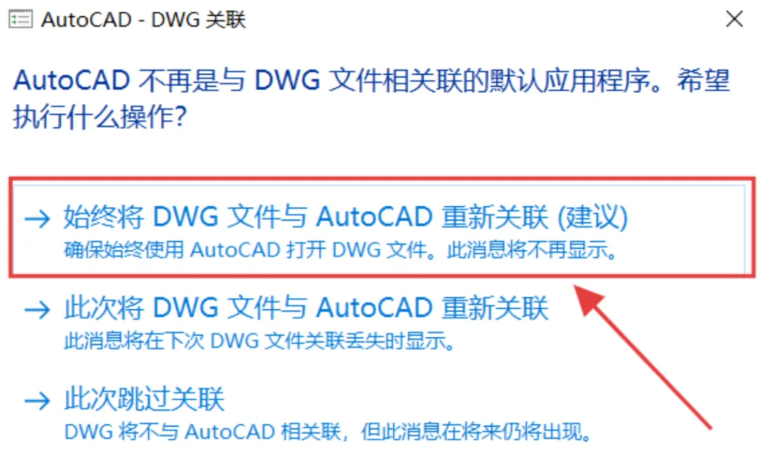 7.如果有这个弹窗点击【始终将DW文件与AutoCAD重新关联】,没有就不用管