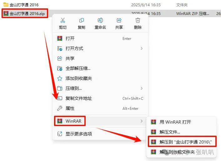 1.选中下载的压缩包,然后鼠标右键选择解压到“金山打字通 2016”(没有解压选项点这里)