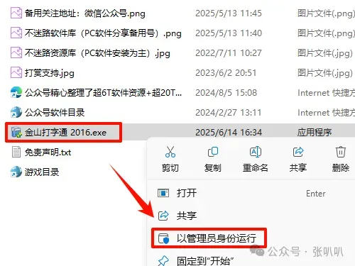 2.打开刚刚解压的文件夹,鼠标右键点击“金山打字通 2016.exe”选择“以管理员身份运行”