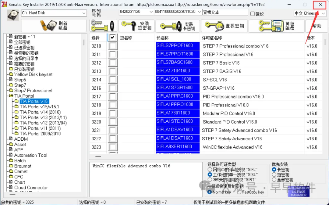 32、依次点击【TIA Portal V16】,勾选【短名称】,勾选【工作地的单一授权“SISL”】,再点击【安装长密钥】