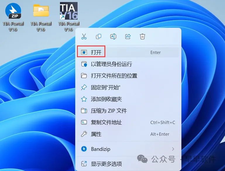 34、回到桌面,右键桌面上的【TIA Portal V16软件图标】,点击【打开】