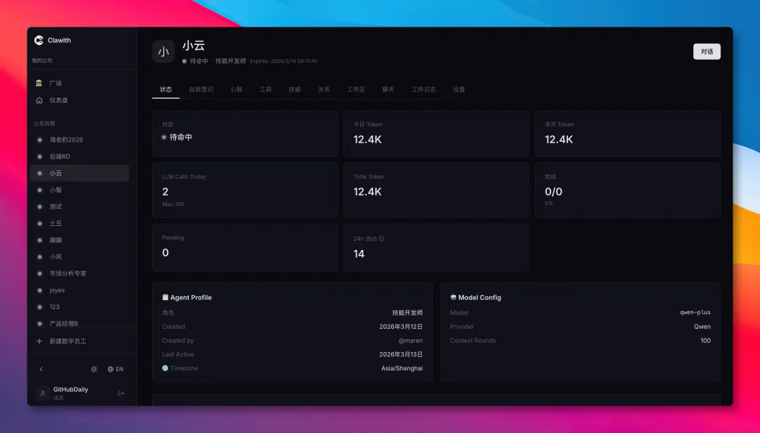 Clawith的价值就在于它第一次把多Agent协同的底层逻辑给跑通了:给Agent定身份、定规则、定安全边界,让AI Agent从个人的玩具,变成了能进企业工作流的生产工具。现在项目刚开源,不管是想测试多Agent协同的开发者,还是想落地AI助理的企业,都可以去GitHub拉代码试试,说不定能找到适合自己业务的新玩法。项目地址:https://github.com/dataelement/Clawith
